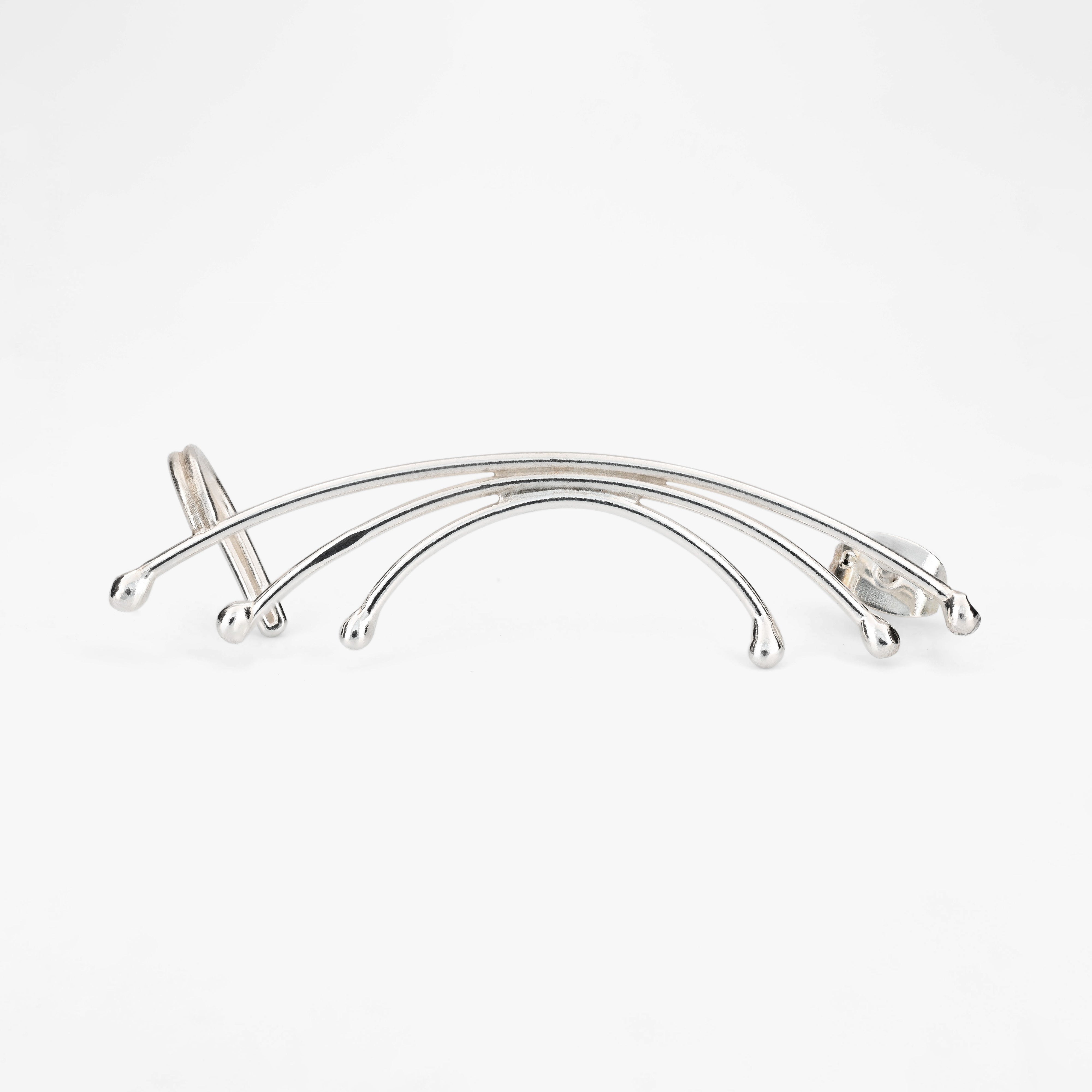 Grapa con diseño curvado que evoca movimientos naturales, adornada con esferas pequeñas. Ideal para aportar dinamismo y sofisticación.