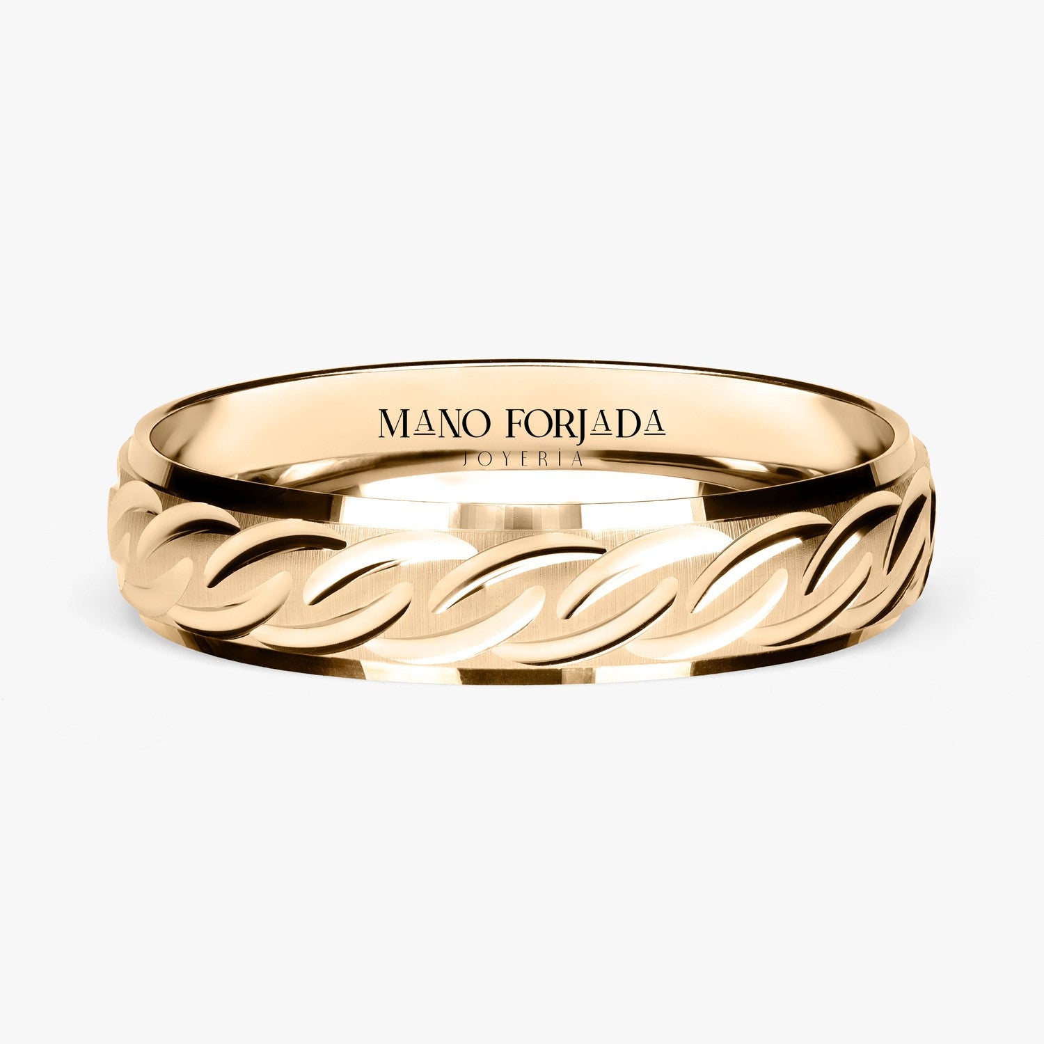 El tipo de argolla que estas viendo es tipo clásica, lo que significa que tiene forma de media caña al interior. Esta argolla es ligera, pero resistente. Esta hecha para durar toda una vida con un cuidado adecuado.