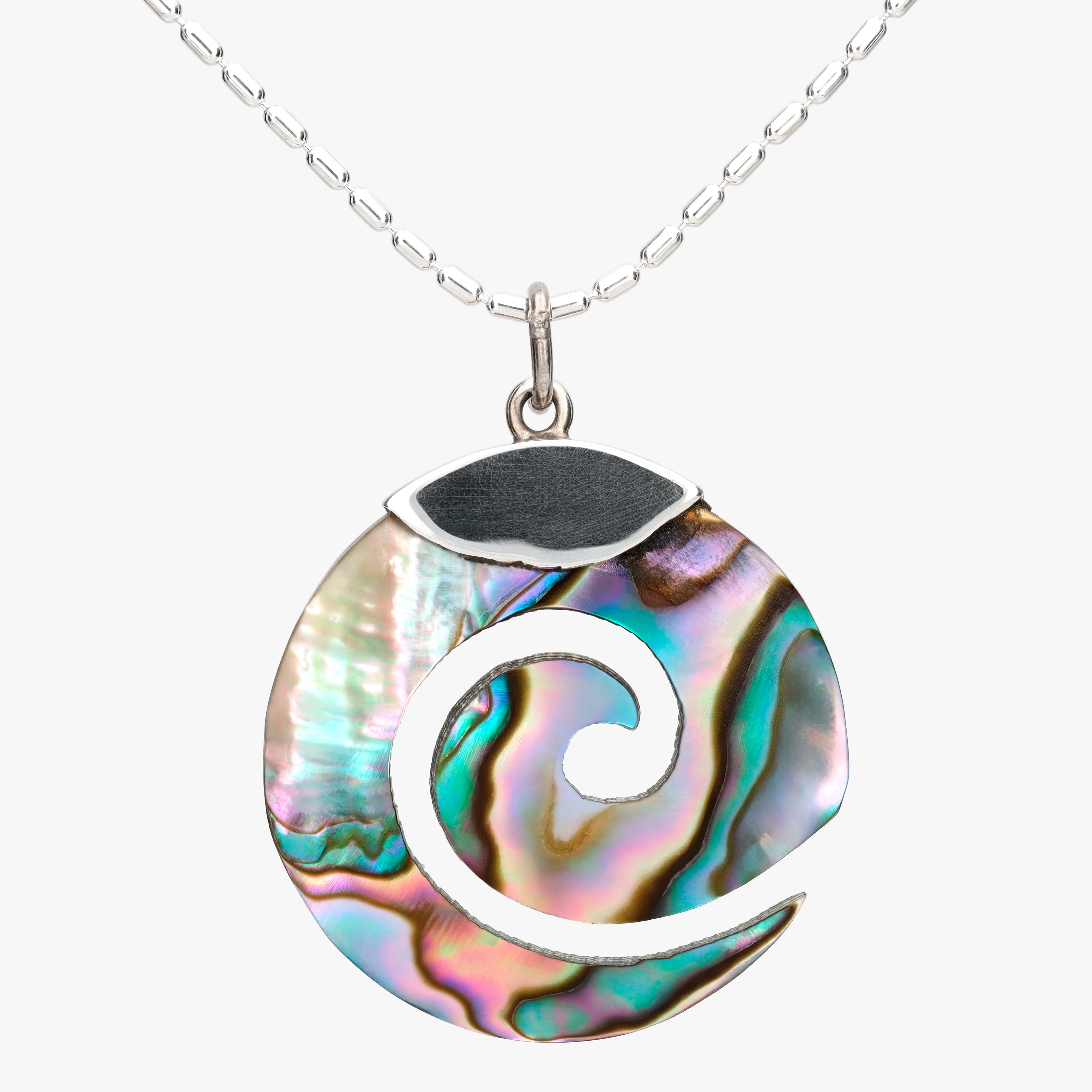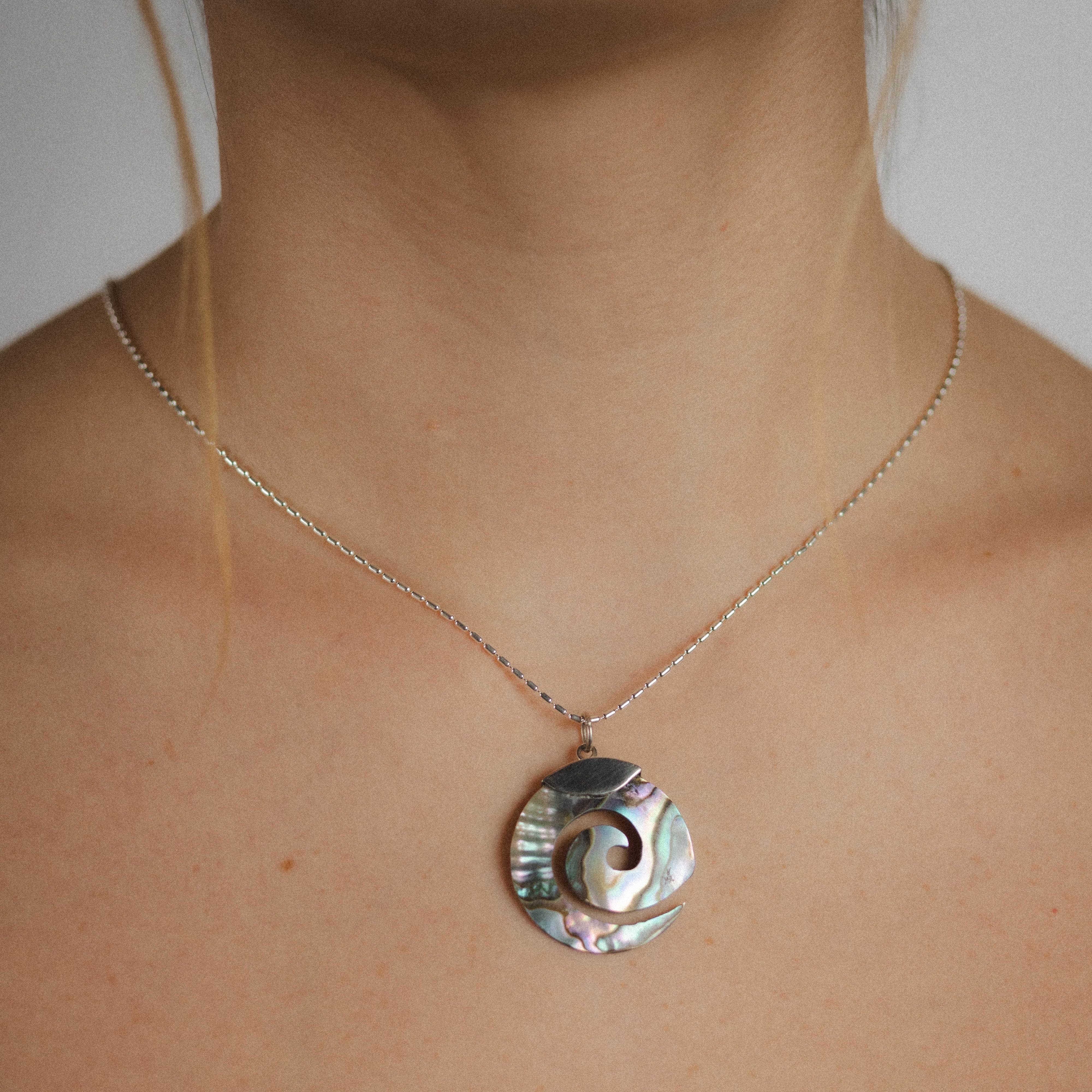 Collar con dije circular elaborado en concha iridiscente, con reflejos tornasol. Incluye una cadena delicada de plata de 45 cm, perfecta para resaltar su brillo único.