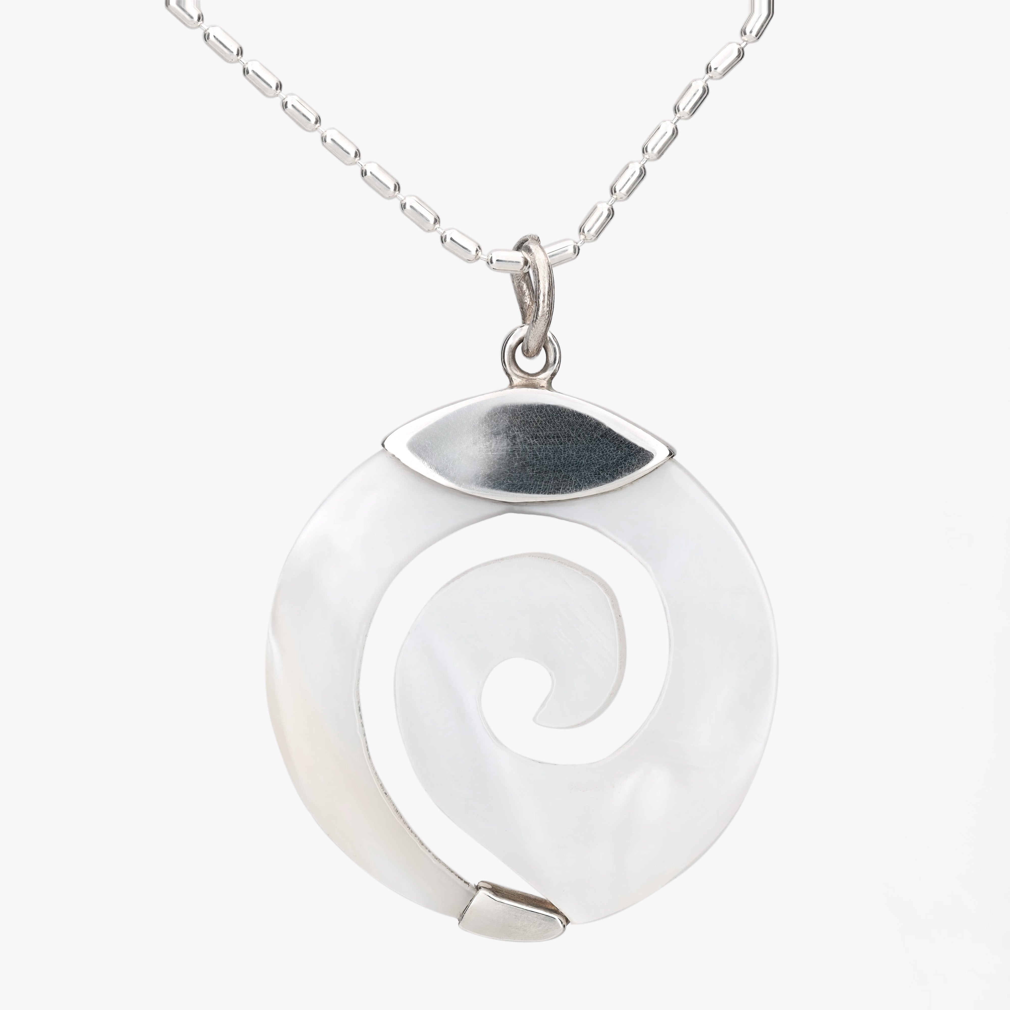 Dije de concha pulida, acompañado de cadena de plata de 45 cm, que acentúa su brillo natural.