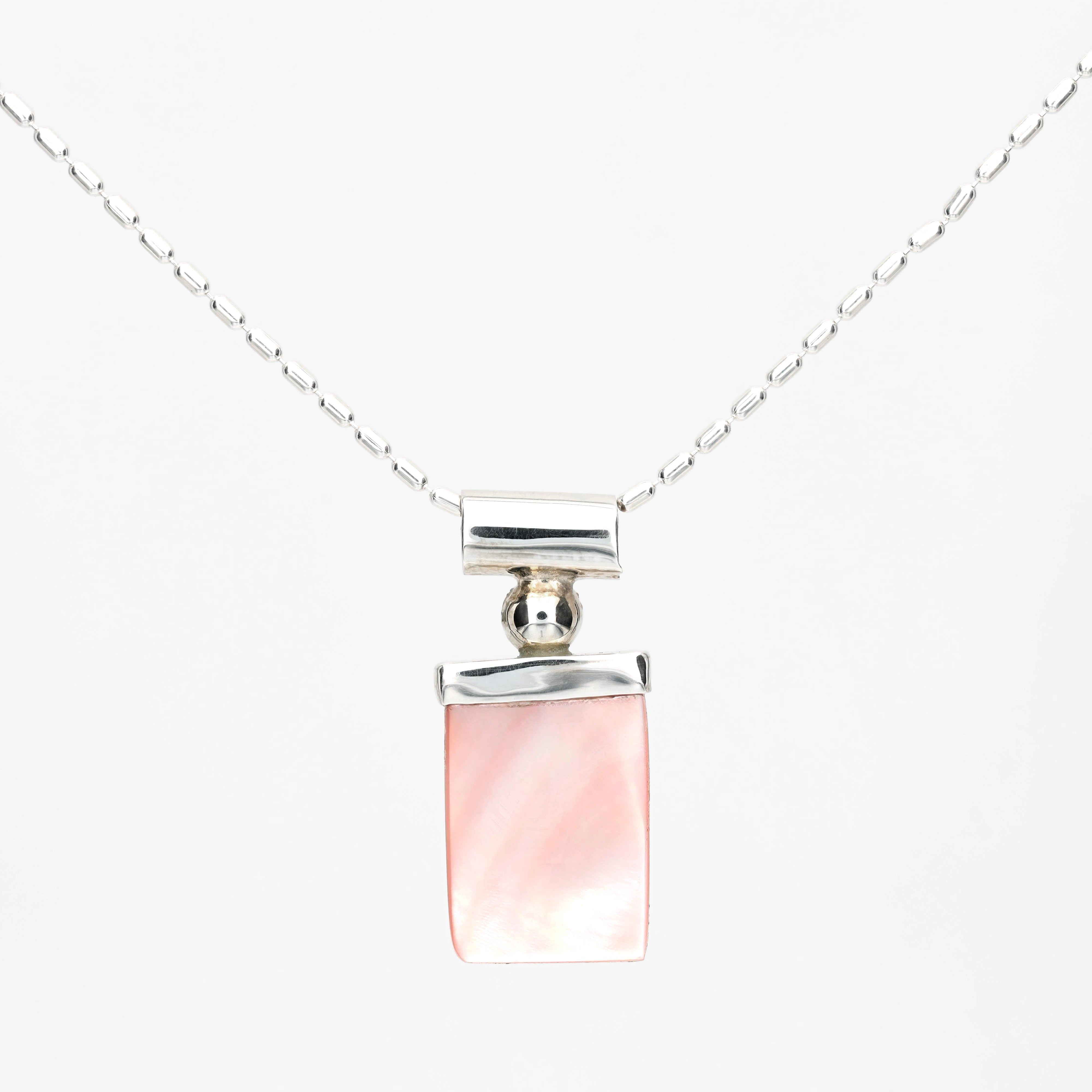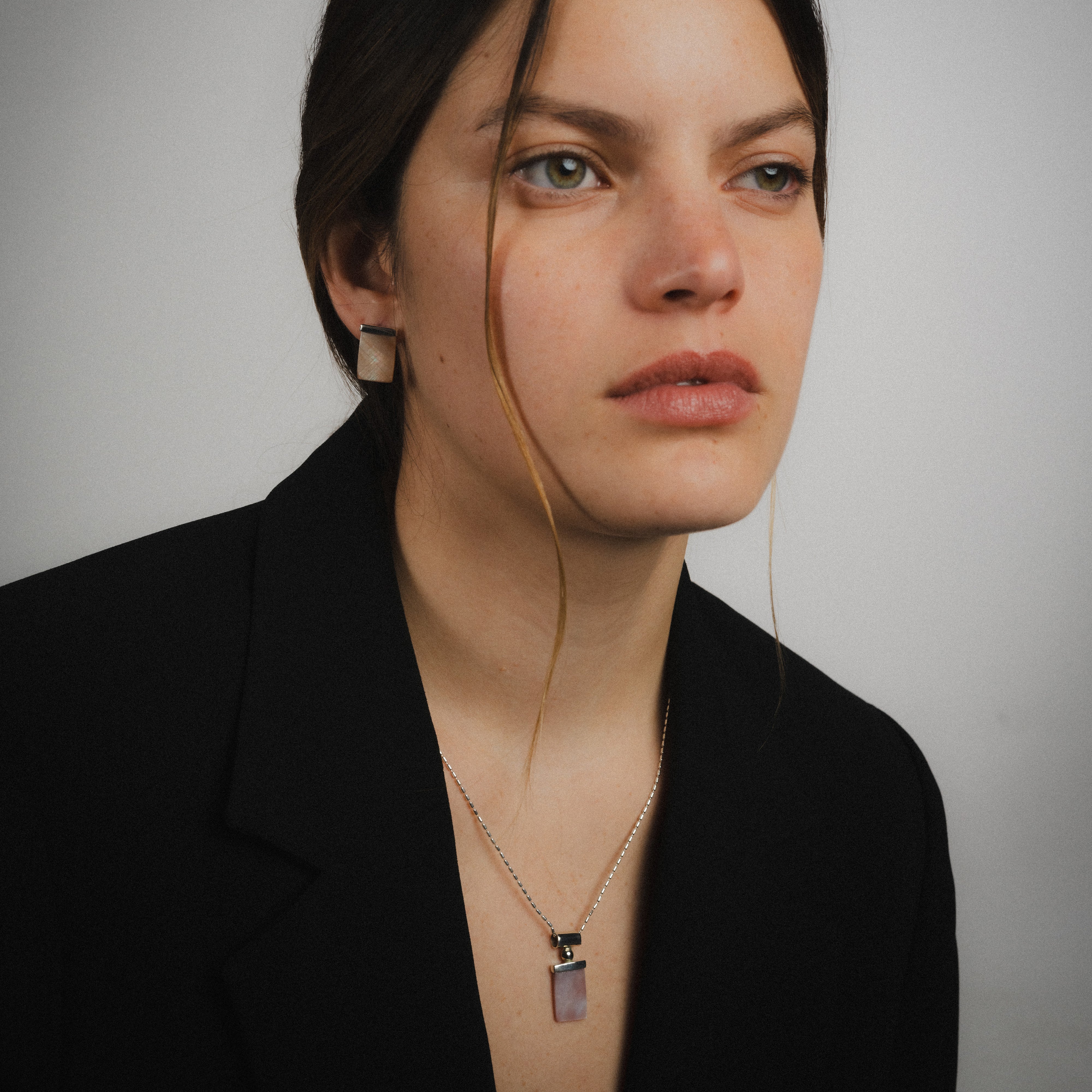 Collar con dije rectangular en Concha Café, complementado con un diseño estilizado en plata. Incluye una cadena de plata de 45 cm y aretes coordinados con el mismo diseño.