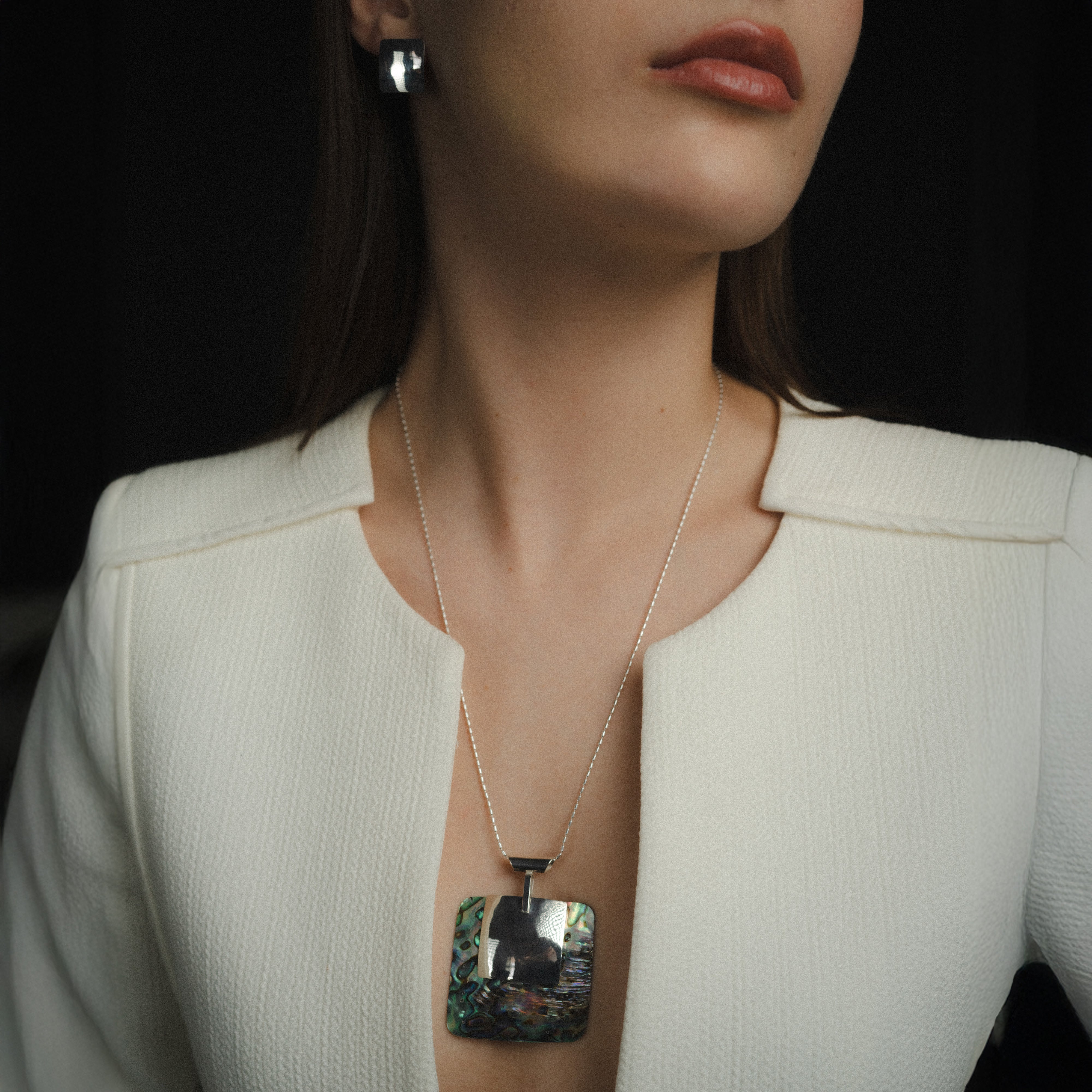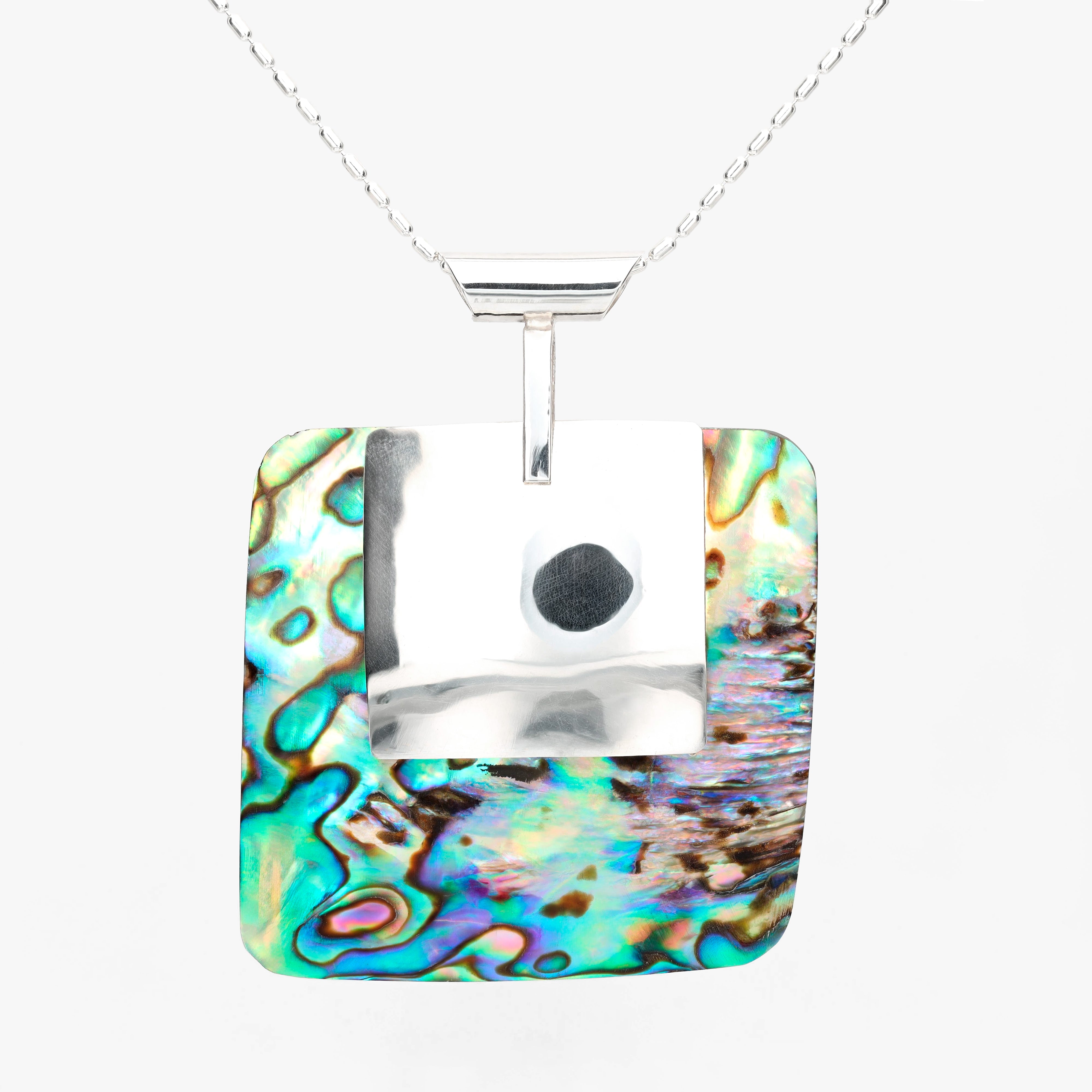 Collar con dije cuadrado elaborado en Concha Abulón, destacando su efecto multicolor natural. Incluye cadena de plata de 45 cm y aretes a juego con diseño y material coordinados.