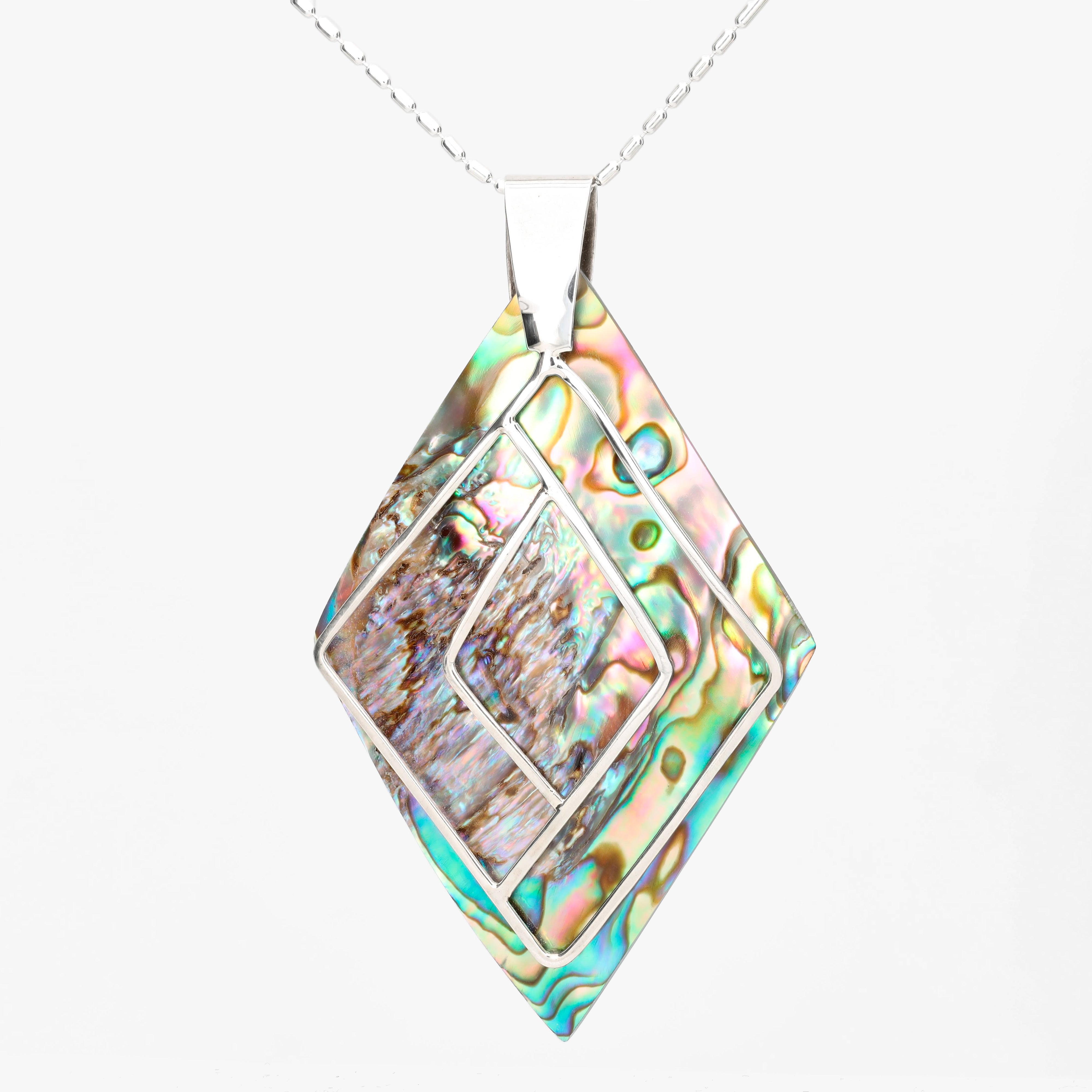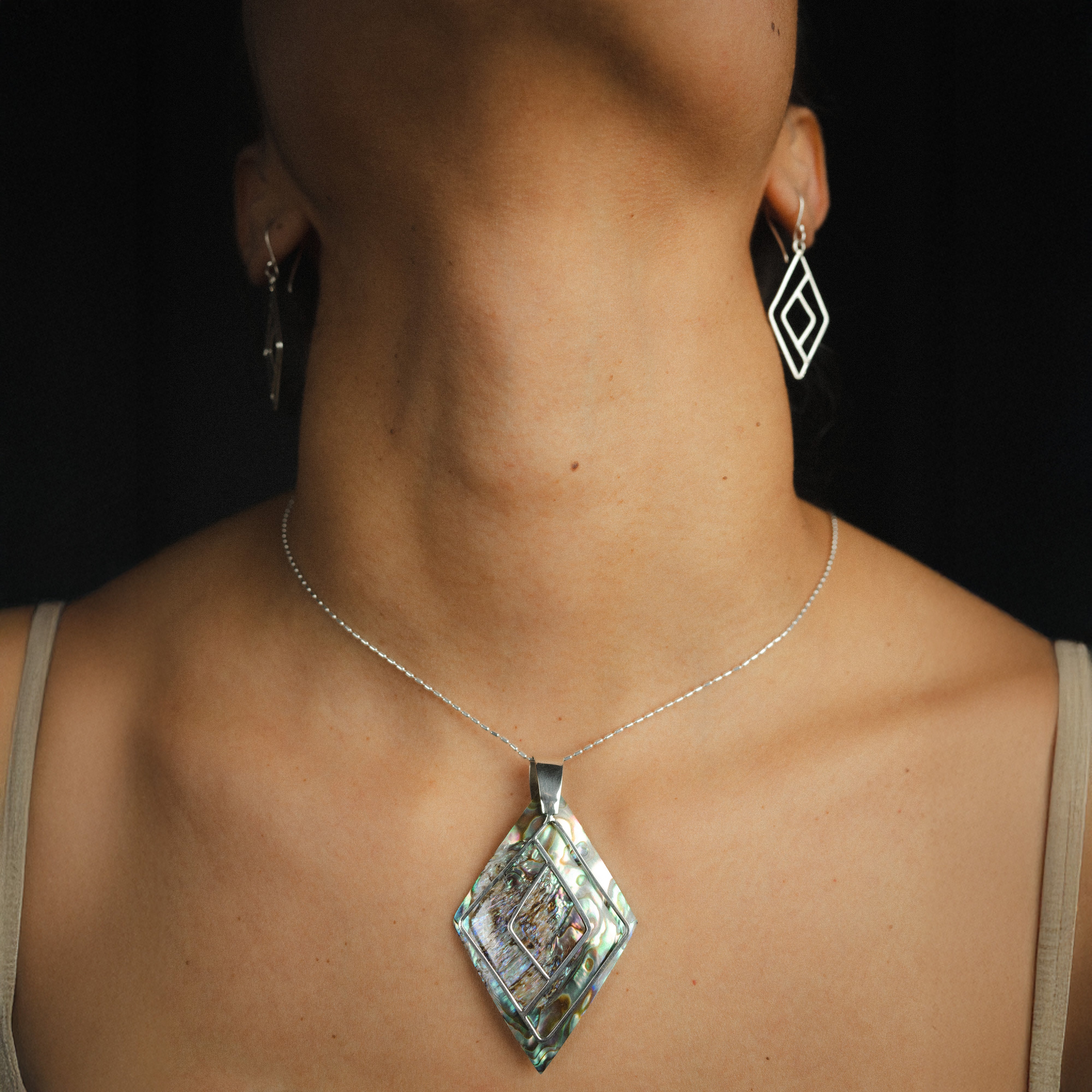 Collar con dije en forma de rombo elaborado con Concha Abulón, destacando su efecto iridiscente. Incluye cadena de plata de 45 cm y aretes coordinados que complementan el conjunto.