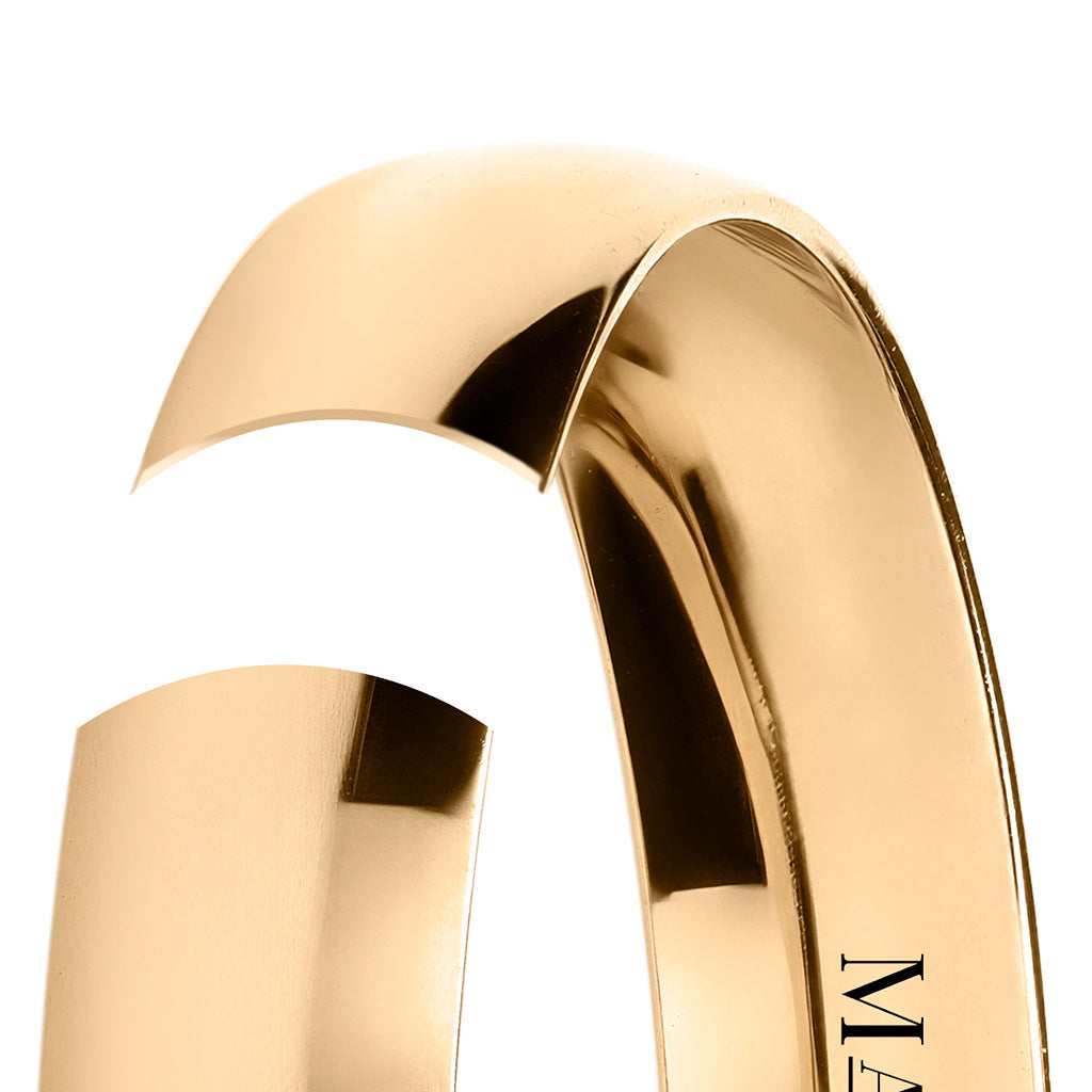 El tipo de argolla que estas viendo es tipo clásica, lo que significa que tiene forma de media caña al interior. Esta argolla es ligera, pero resistente. Esta hecha para durar toda una vida con un cuidado adecuado.